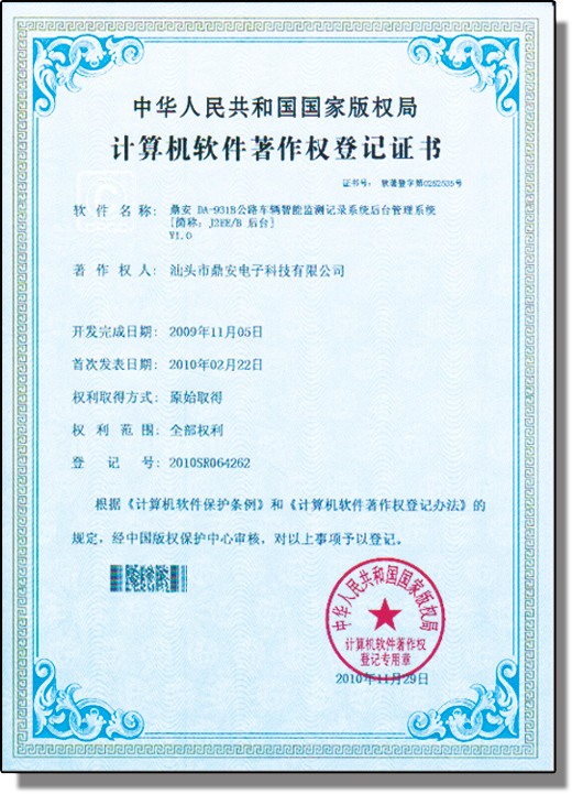 DA-931后平臺(tái)數(shù)據(jù)管理系統(tǒng)嚴(yán)格按照GA/T 497-2009《公路車輛智能監(jiān)測記錄系統(tǒng)通用技術(shù)條件》、《廣東省治安卡口視頻監(jiān)控系統(tǒng)建設(shè)規(guī)范》、GA/T 496–2009《闖紅燈自動(dòng)記錄系統(tǒng)通用技術(shù)條件》等相關(guān)公共安全行業(yè)標(biāo)準(zhǔn),對整個(gè)系統(tǒng)建設(shè)進(jìn)行了詳細(xì)規(guī)劃設(shè)計(jì),充分體現(xiàn)出安全、實(shí)用、合理、易維護(hù)等特點(diǎn)。該系統(tǒng)已得到國家版權(quán)局計(jì)算機(jī)軟件著作登記權(quán)證書(軟著登字第0252535號(hào))。